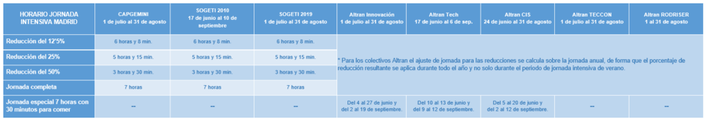 Como cada año, y dado que restan escasas semanas para iniciar la jornada intensiva de verano, hemos elaborado un calendario para las personas trabajadoras del centro de trabajo de Capgemini-Madrid. En dicho calendario, os informamos acerca del periodo de jornada intensiva de verano, de las horas a realizar durante este periodo y las compensaciones que conlleva el no disfrute de la jornada intensiva:
