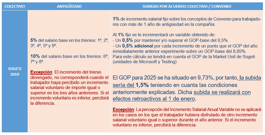 Tras el comunicado inicial que enviamos el pasado 15 de diciembre, queremos informaros de las subidas salariales que corresponden al colectivo de Sogeti integrado en 2019, una vez que la empresa nos acaba de facilitar el dato del GOP en 2025 para dicho colectivo, tras la solicitud de información que realizamos a la misma.